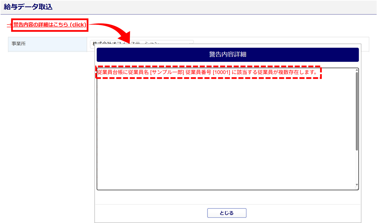 2246|警告:従業員台帳に従業員名 [氏名] 従業員番号 [番号] に該当する従業員が複数存在します。