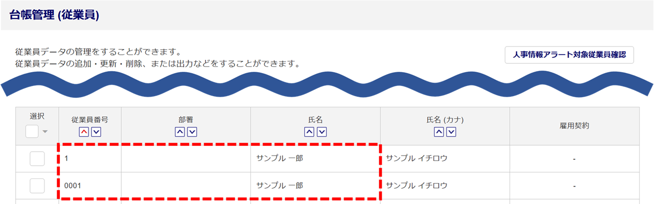 従業員台帳に、同一と認識される従業員番号*、かつ、同一氏名の従業員情報が重複して登録されていることが原因で表示される警告です。