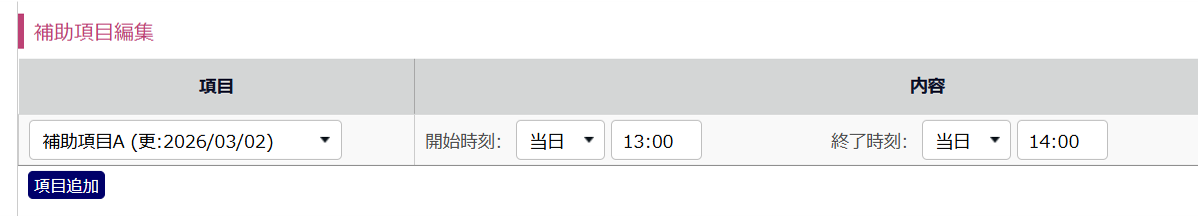 種別 ※ホーム画面「設定」内[その他]>[オプション]> 「勤怠管理設定」カテゴリ内「補助項目編集機能」 が「使用する」になっている場合に表示されます。