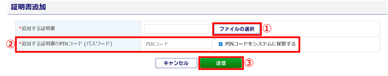 「追加する証明書のPINコード(パスワード)」(②)を入力し、[送信](③)をクリックします。
