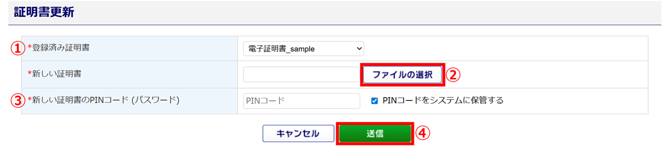 [ファイルの選択](②)をクリックし、新しい電子証明書ファイルを選択します。