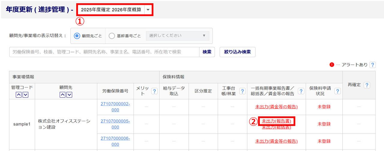 「対象年度」(①)を選択し、「一括有期事業報告書 (建設の事業)」を作成する事業場の[未出力(報告書)](②)をクリックします。
