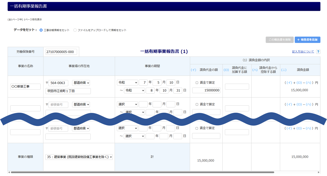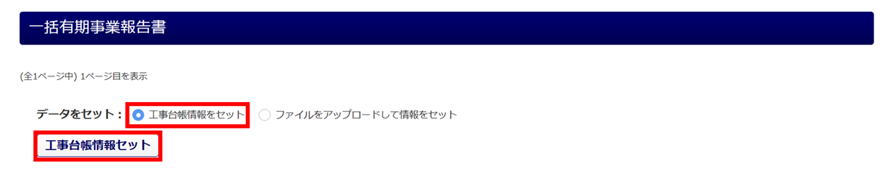 「一括有期事業報告書」欄に、工事台帳の情報が反映されます。本マニュアル内「一括有期事業報告書」にお進みください。