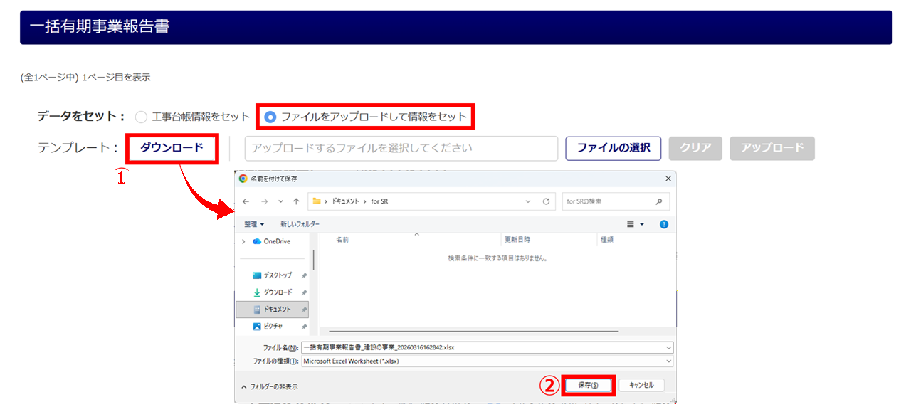 ※ファイル名は、「一括有期事業報告書_建設の事業_yymmddhhmmss.xlsx」です。