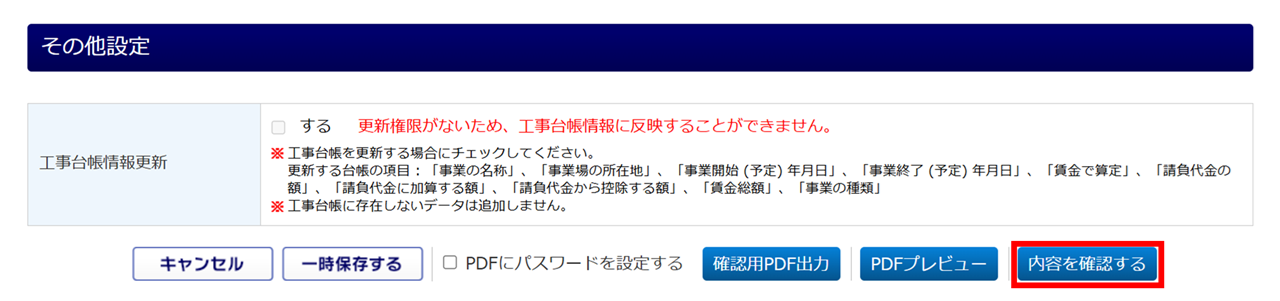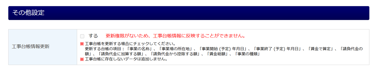「一括有期事業報告書」欄の内容を工事台帳へ更新する場合は、「工事台帳情報更新」項目の「する」にチェックします。更新される項目の詳細は、以下の補足をご参照ください。