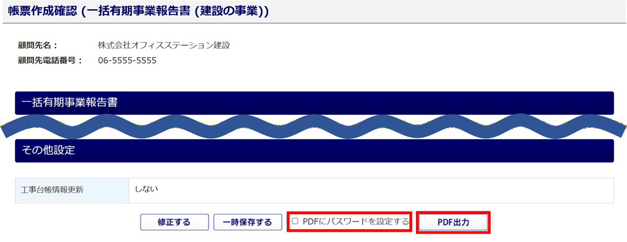 作成した帳票をPDFに出力して確認する場合は、[確認用PDF出力]をクリックします。