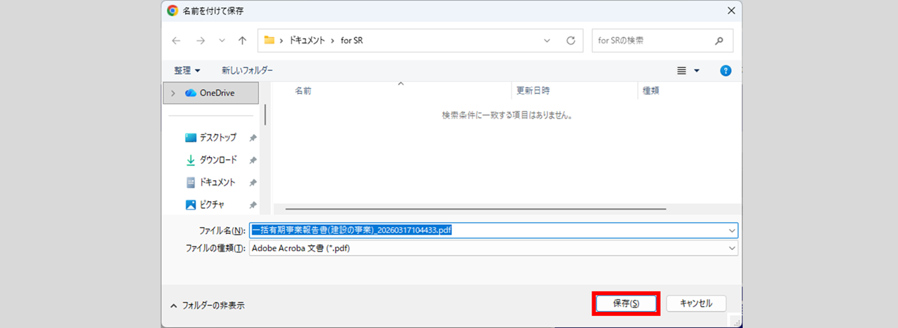 操作しているPCのファイル画面が表示されますので、任意のフォルダを指定し、[保存]をクリックします。