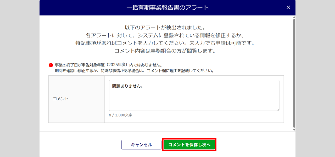 入力内容が正しい旨を「コメント」欄に入力し、[コメントを保存し次へ]をクリックします。