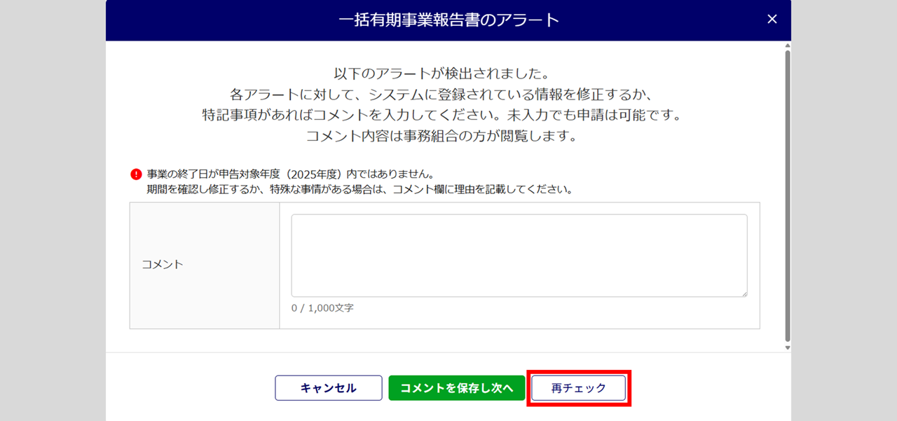 アラート画面が表示されている状態のまま修正をおこない、[再チェック]をクリックします。