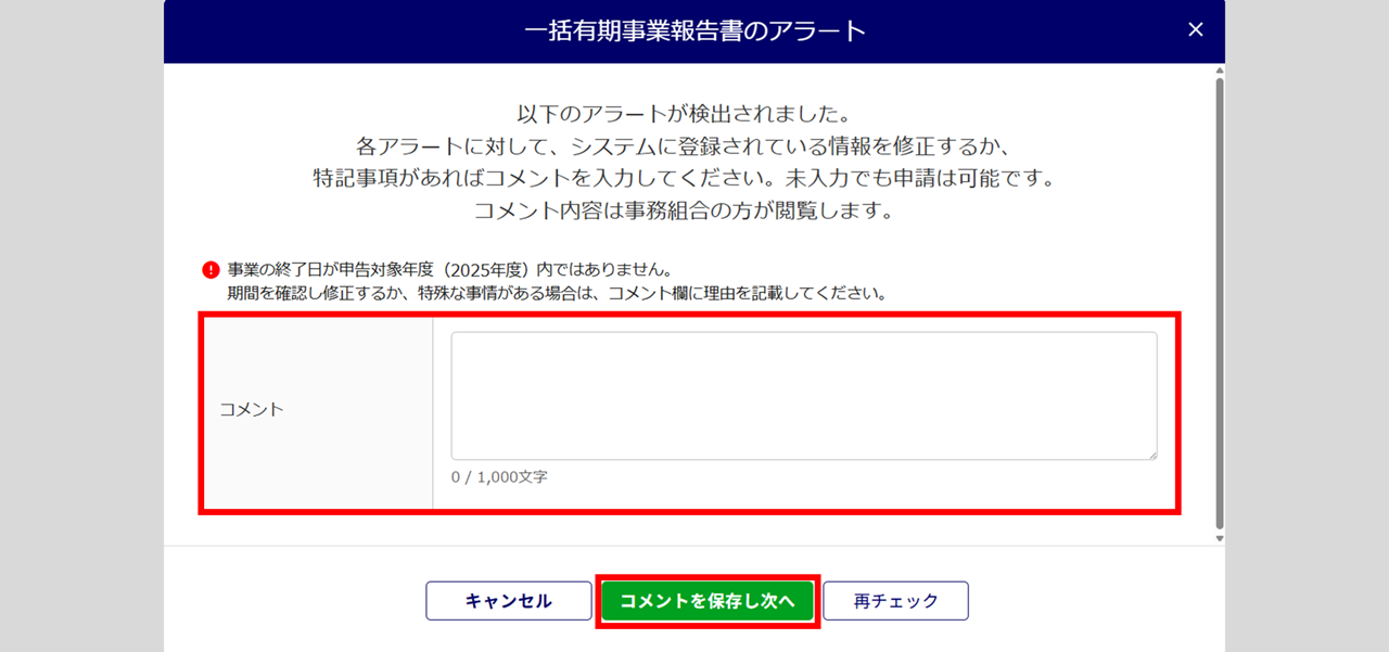 アラート内容が解消されたら、本マニュアル内「内容を確認」に戻り、操作を続けてください。 - 入力内容の修正が必要ない場合