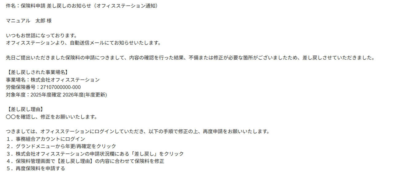 - 件名 : 保険料申請 差し戻しのお知らせ(オフィスステーション通知)