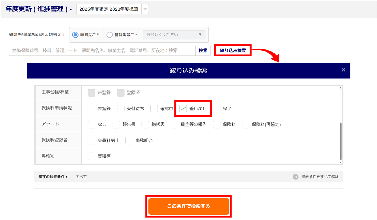 [絞り込み検索]をクリックし、「保険料申請状況」の「差し戻し」にチェック、[この条件で検索する]をクリックしてください。