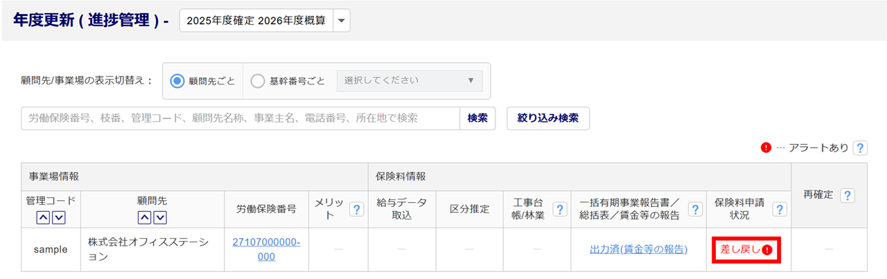 「保険料申請状況」列の[差し戻し]をクリックします。