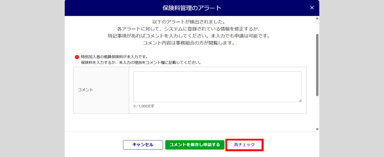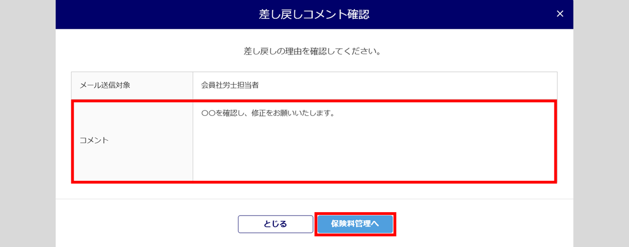 [確認する]をクリックすると、「保険料管理のアラート」画面が表示され、アラート内容とコメントを確認できます。