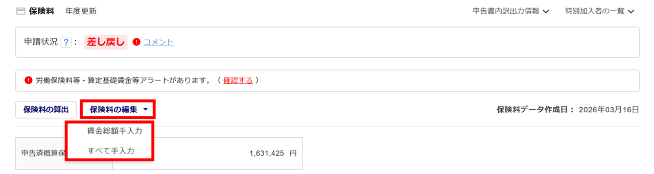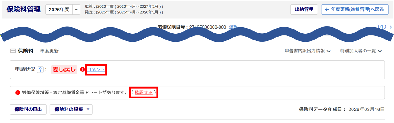 保険料の申請時にアラートありの状態で保険料の申請をおこなった場合、[差し戻し]の文字の横に「