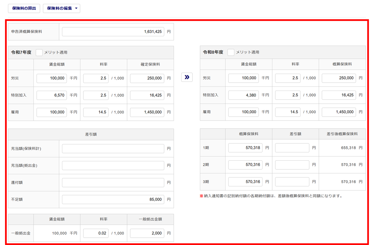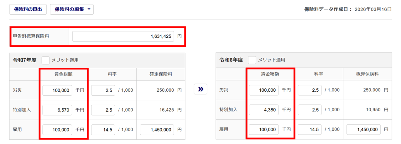 「申告済概算保険料」「賃金総額」の修正が可能です。