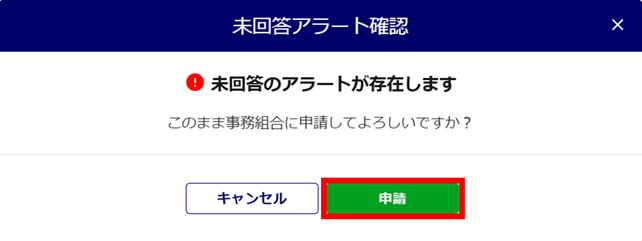 コメントを入力せずに、[コメントを保存し申請する]をクリックすると、「未回答アラート確認」画面が表示されます。