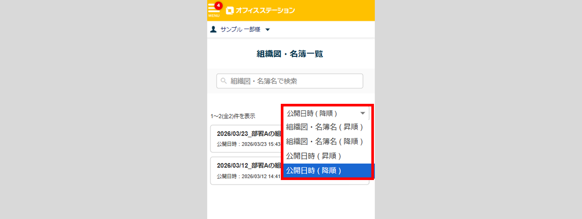 プルダウンより、「組織図・名簿名」や「公開日時」で絞り込みが可能です。