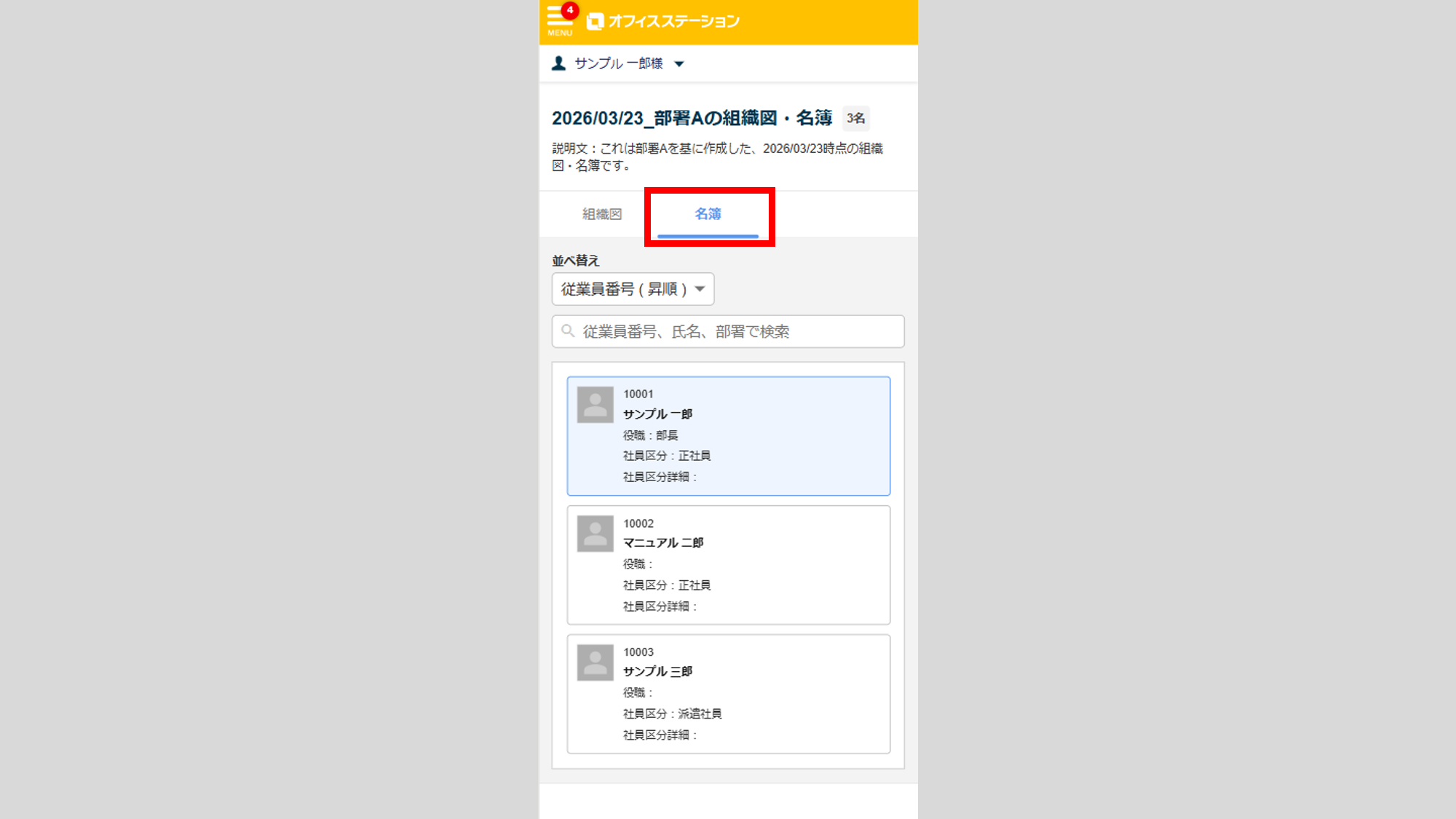 [名簿]タブに切り替えると、組織図に登録されている従業員を一覧で確認できます。