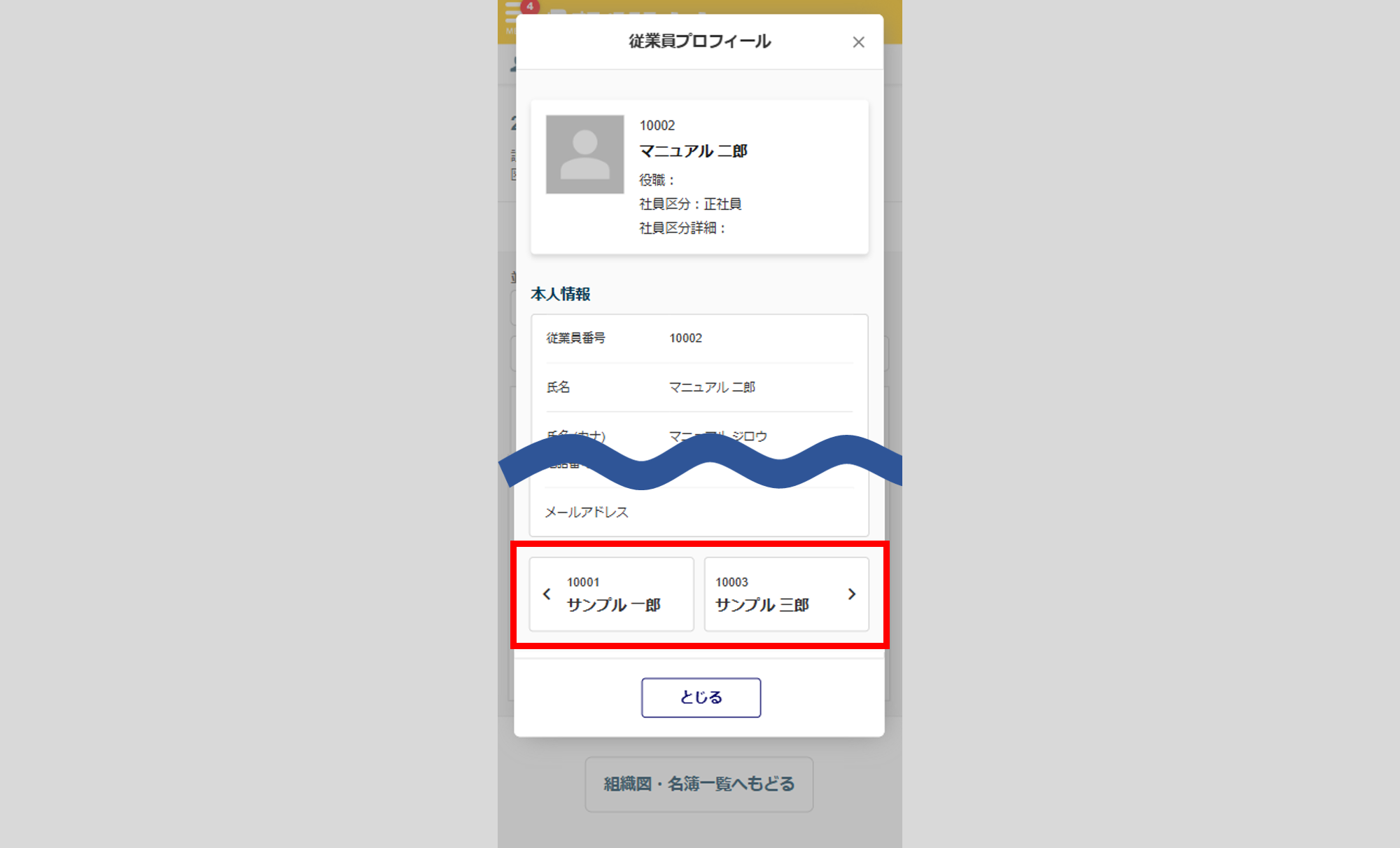 従業員プロフィール画面の下部までスクロールすると、一覧の前後の従業員のプロフィールに切り替えが可能です。