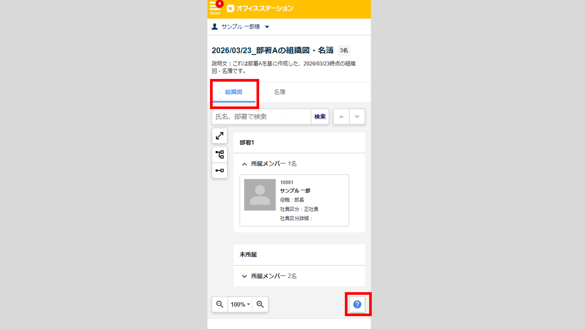 ※画面右下の「?(はてなマーク)」より、組織図の展開の操作方法を確認できます。
