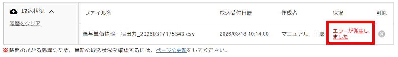 アップロード処理時にエラーが発生した場合、「取込状況」に赤字のメッセージが表示されます。