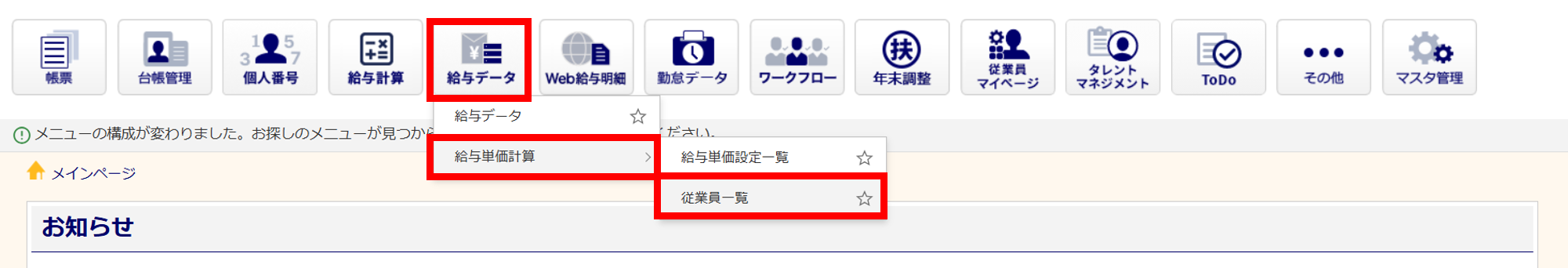 [給与データ]>[給与単価計算]>[従業員一覧]をクリックします。