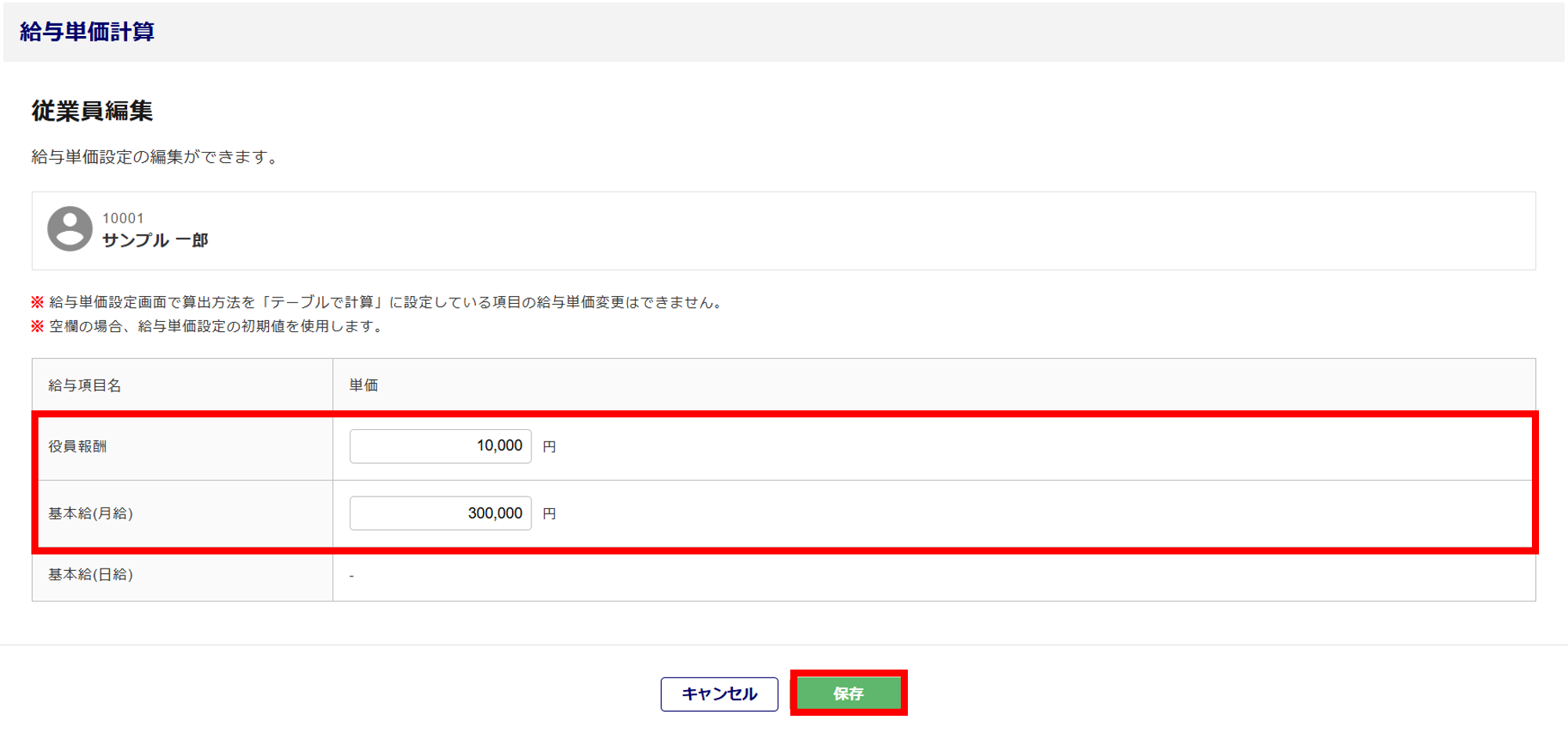 編集できる給与単価は、「給与単価設定」にて「手入力する」と設定している項目のみです。