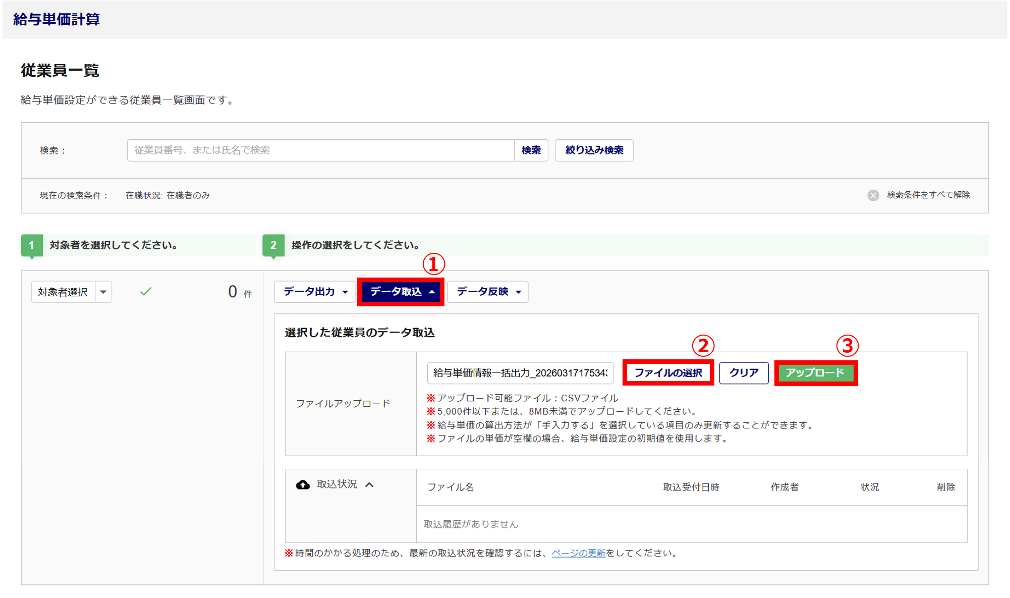 [データ取込](①)>[ファイルの選択]より編集したCSVファイルを選択(②)>[アップロード](③)をクリックします。