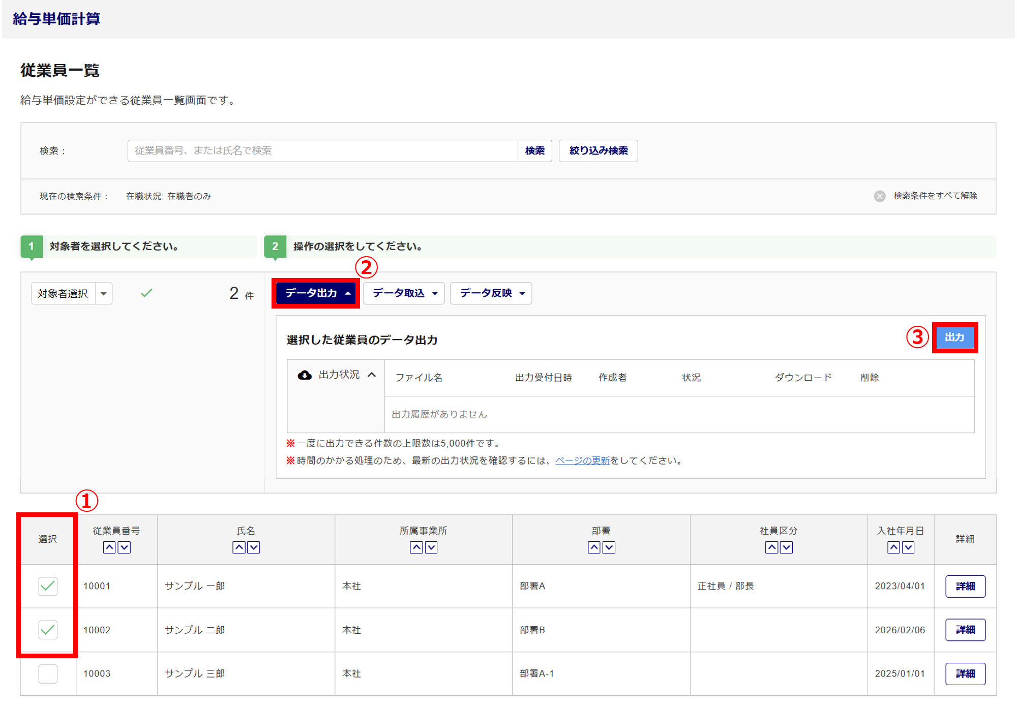 出力対象の従業員を選択(①)>[データ出力](②)>[出力](③)をクリックします。