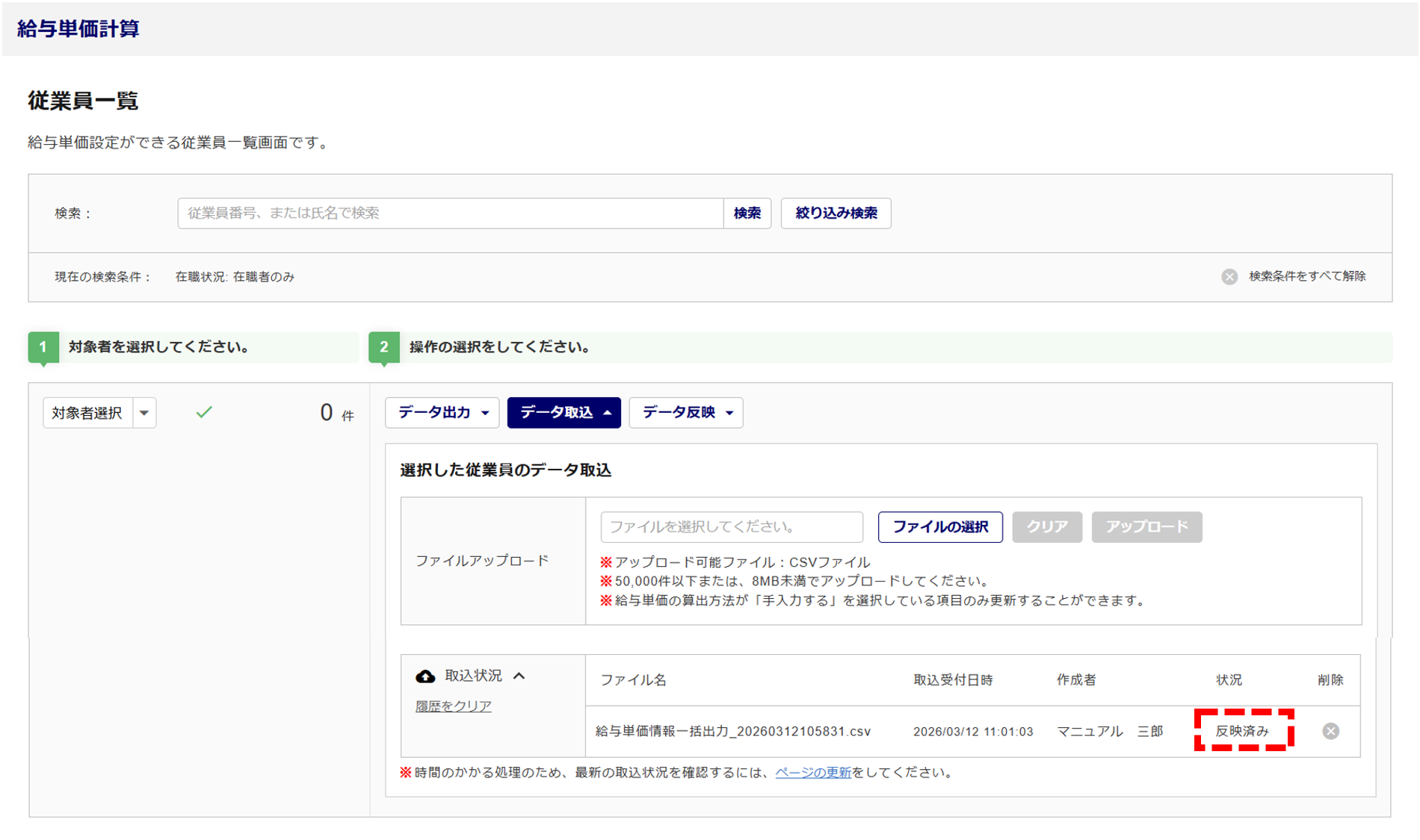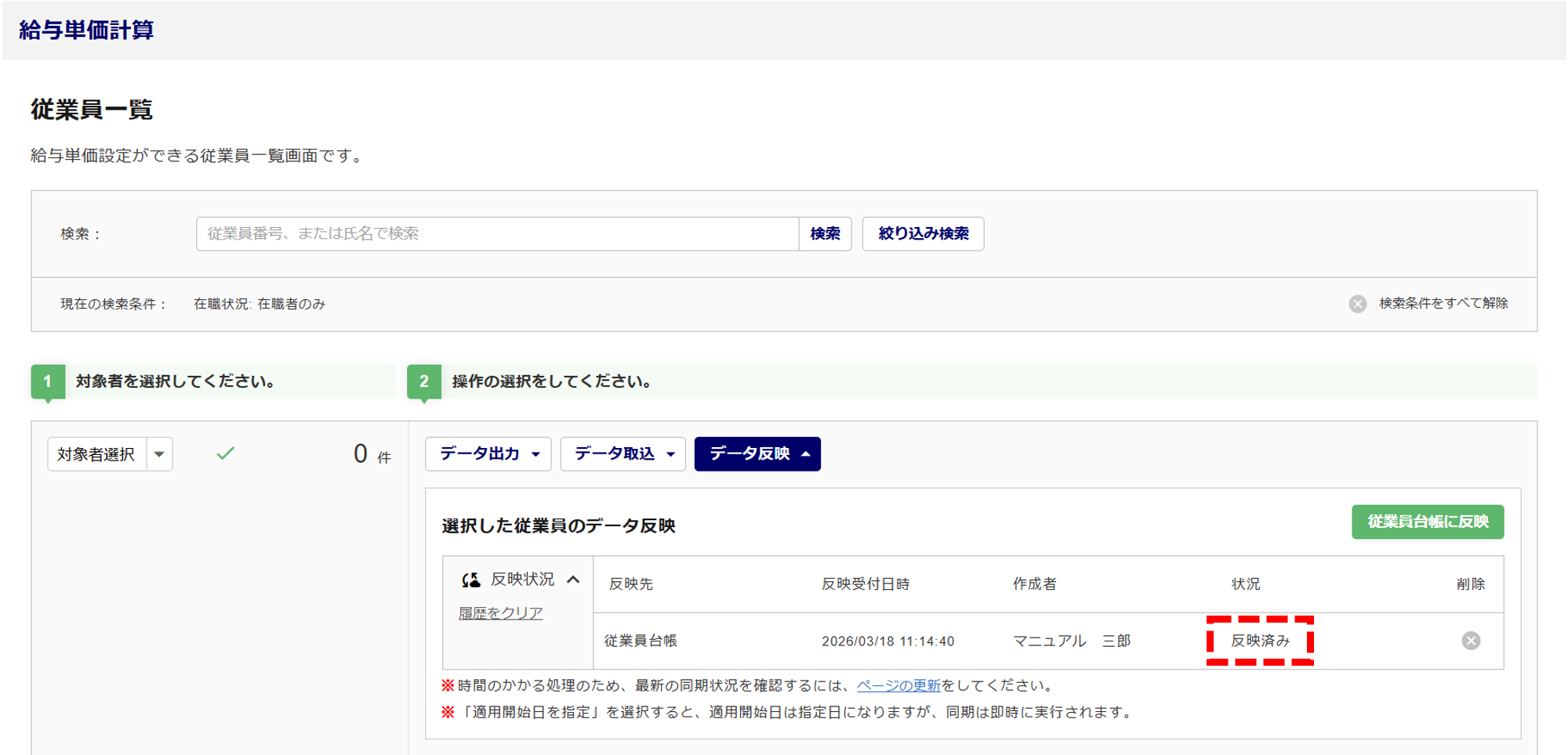 「反映状況」に「反映済み」と表示されたら、従業員台帳へ反映完了です。