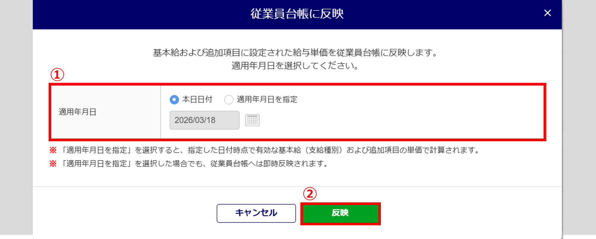 「適用年月日」(①)を設定し、[反映](②)をクリックします。