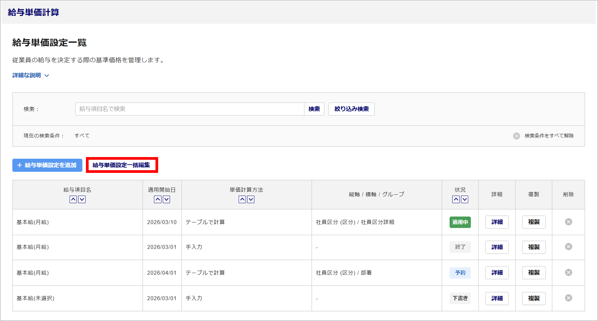 「給与単価設定」の「単価」を一括で編集する場合、[給与単価設定一括編集]をクリックします。