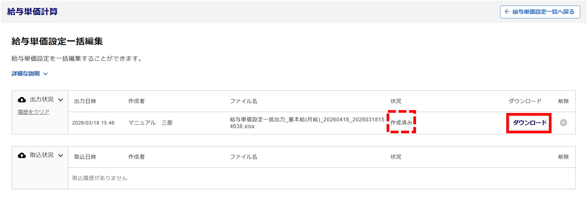 「出力状況」に「作成済み」と表示されているのを確認し、[ダウンロード]をクリックします。