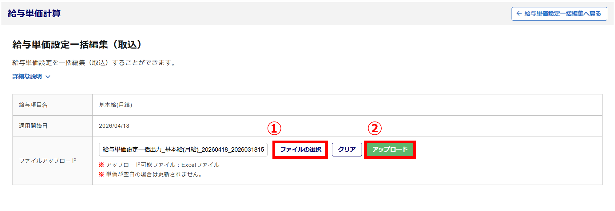 [ファイルの選択](①)より編集したExcelファイルを選択>[アップロード](②)をクリックします。
