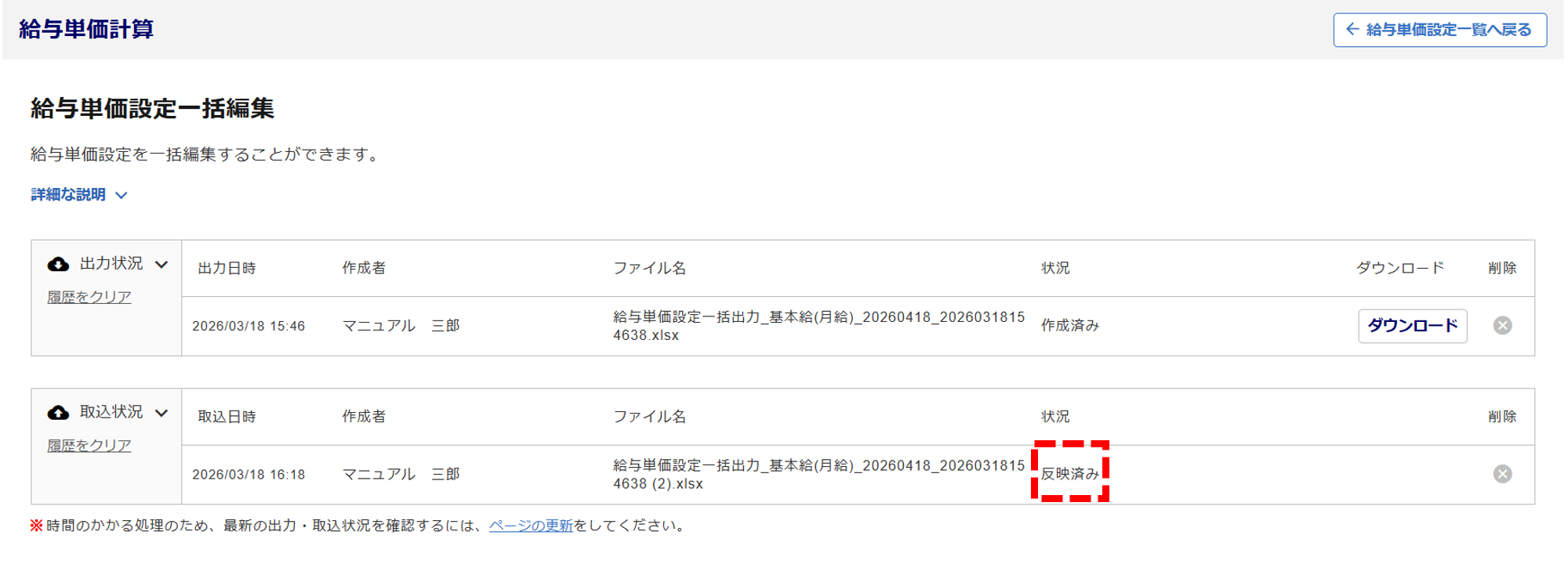 「取込状況」に「反映済み」と表示されたら、取込完了です。