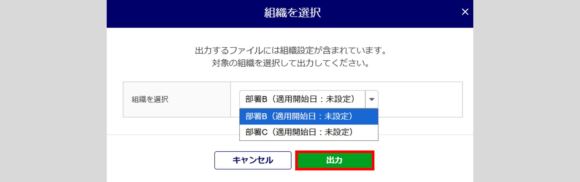 「縦軸設定」、「横軸設定」、「グループの設定」のいずれかに「部署」が設定されている場合、組織を選択後に[出力]をクリックします。