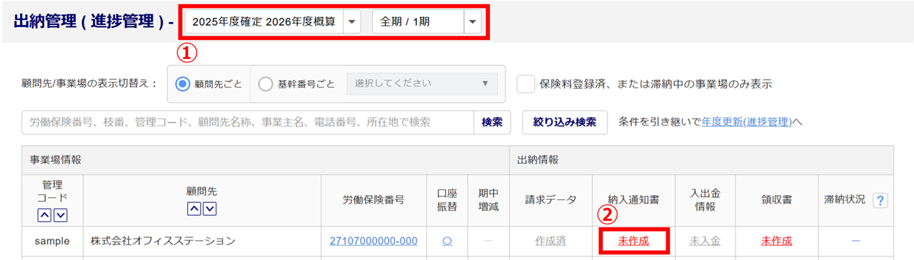 「対象年度」「出納時期」(①)を選択し、「納入通知書」列の[未作成](②)をクリックします。