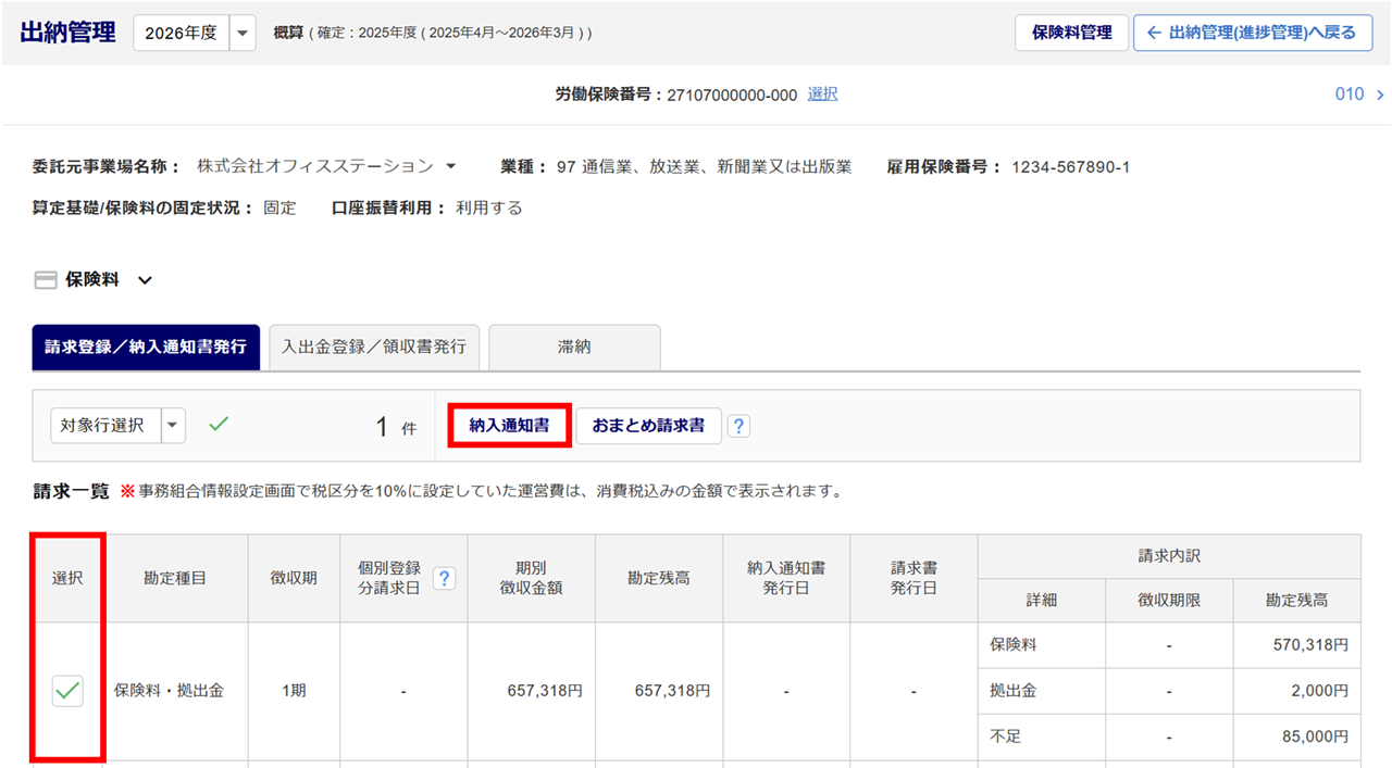 同一の年度・期に該当する複数の複数の事業場や一人親方を選択し、納入通知書を一括発行する場合は、「[帳票]アイコンからの操作」をご確認ください。