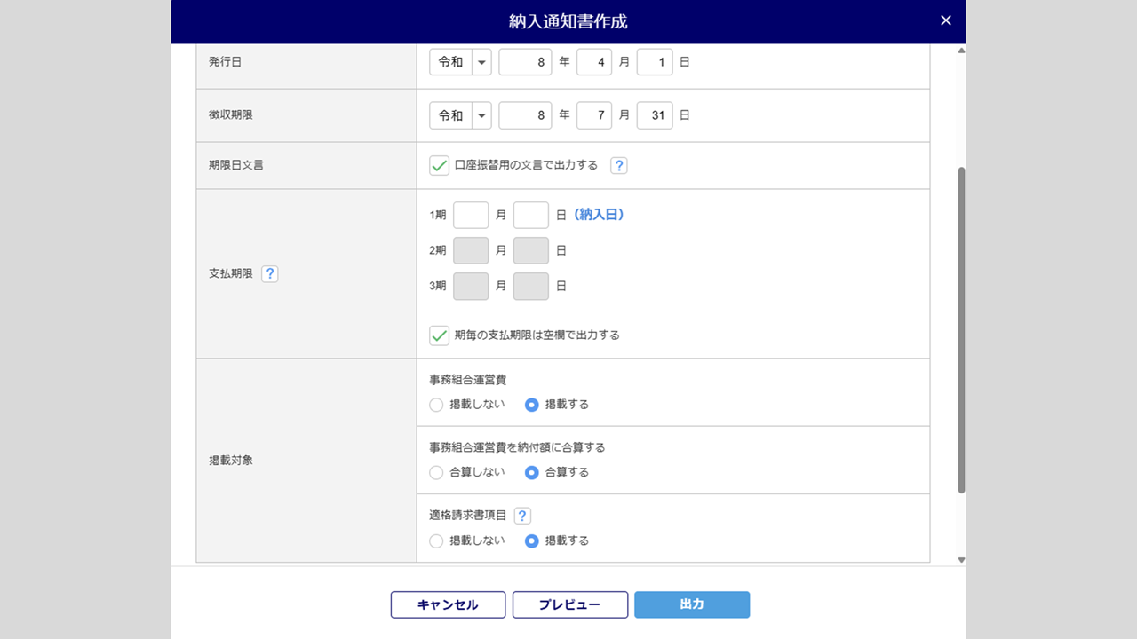 | 請求期 | 選択した請求データの「徴収期」が自動で反映されます。 |