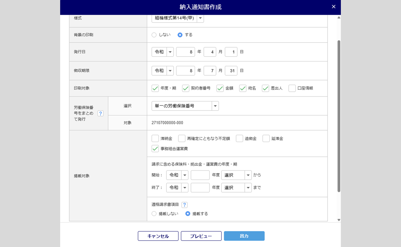 | 様式 | 納入通知書の様式を以下から選択します。 ・組様式第7号(甲) ・組機様式第7号 ・組機様式第14号(甲) ・組機様式第14号(乙) |