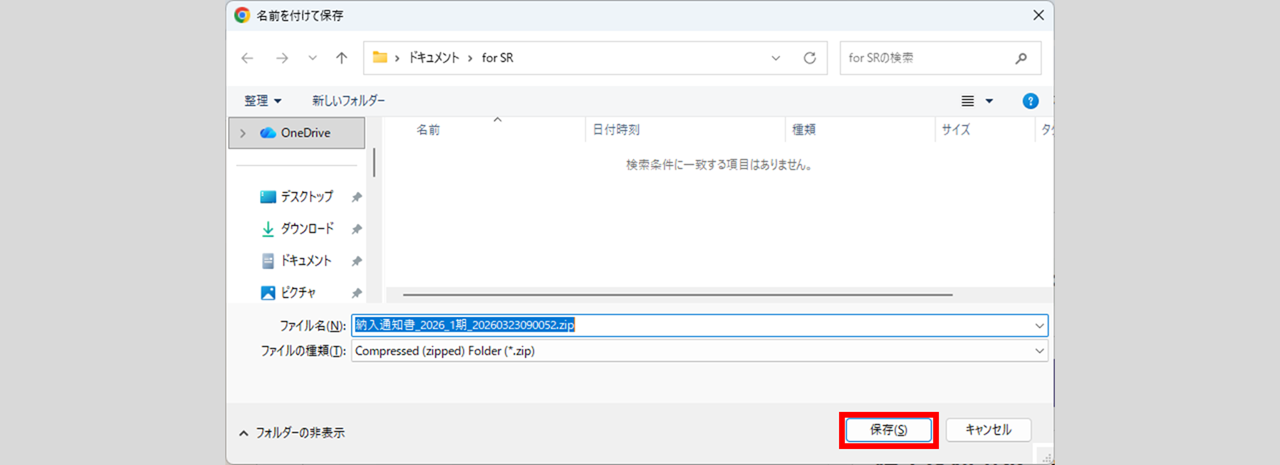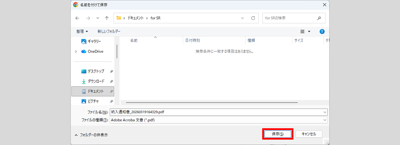 操作しているPCのフォルダ画面が表示されますので、任意のフォルダを指定し、[保存]をクリックします。