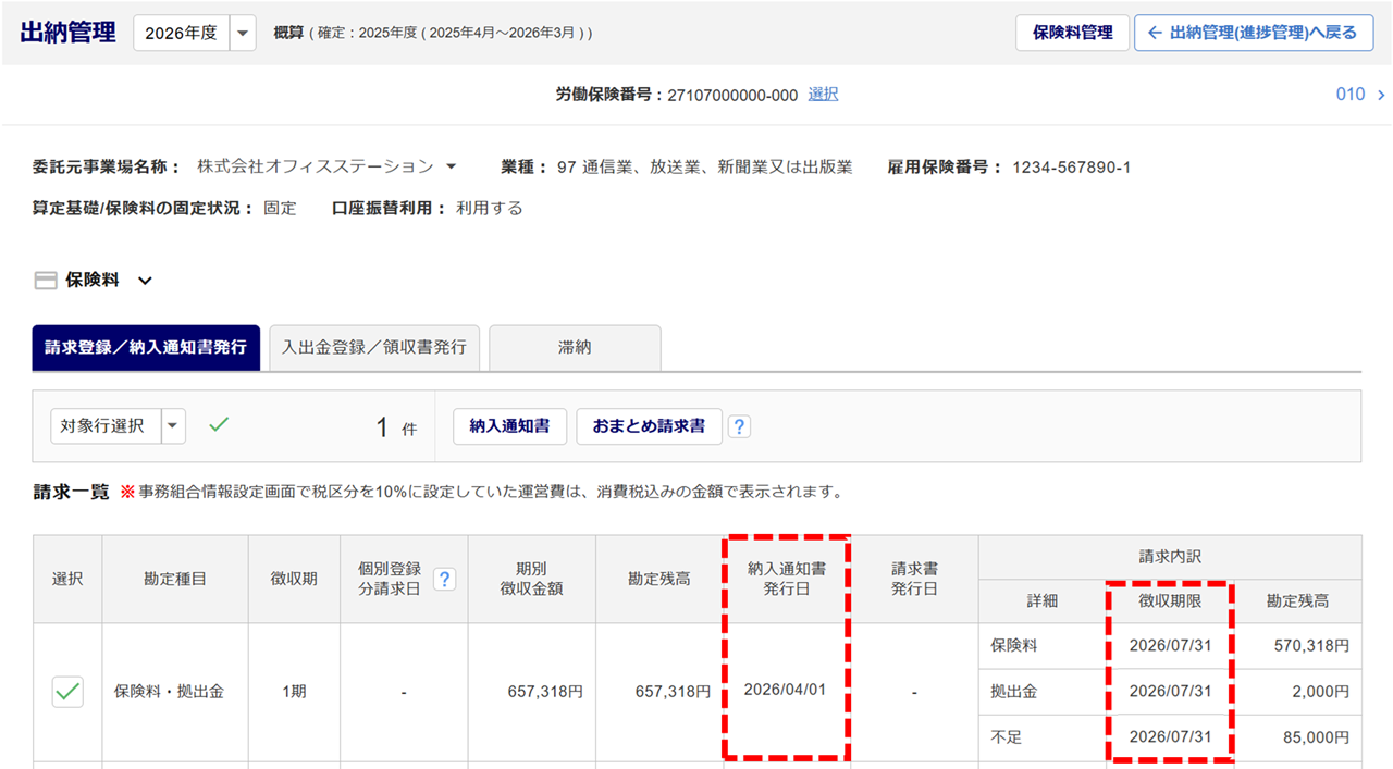 出力時に入力した「発行日」「徴収期限」が一覧に反映されます。