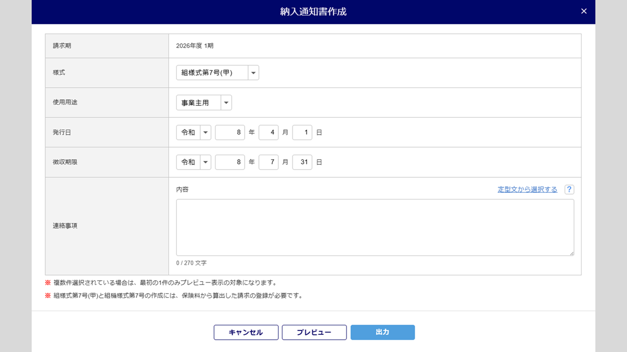 | 連絡事項 | [定型文から選択する]をクリックし、事務局で設定している定型文を選択すると、選択した定型文が内容に反映されます。 滞納分を請求金額に含める場合、説明を入力してください。 |