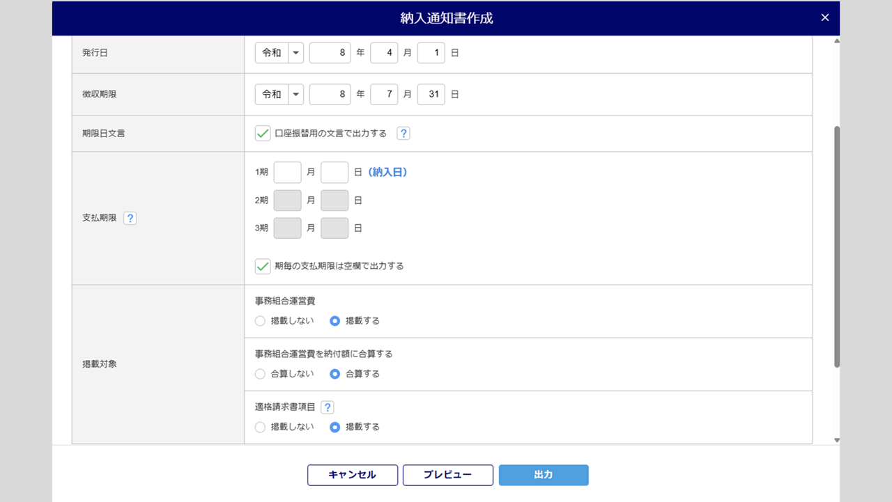 「期毎の支払期限は空欄で出力する」にチェックすると、納入通知書の『支払期限』に該当する箇所が空欄扱いで出力します。