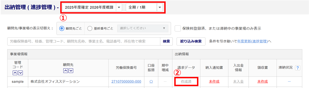 「対象年度」「出納時期」(①)を選択し、「請求データ」列の[作成済](②)をクリックします。