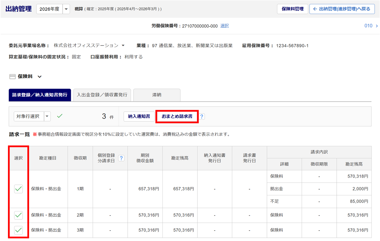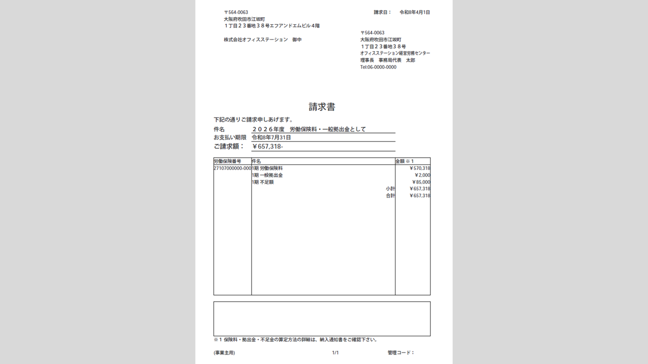 複数事業場分の掲載、滞納・追徴・延滞・運営費などの同時掲載が可能であり、請求の合計額の把握が容易になります。
