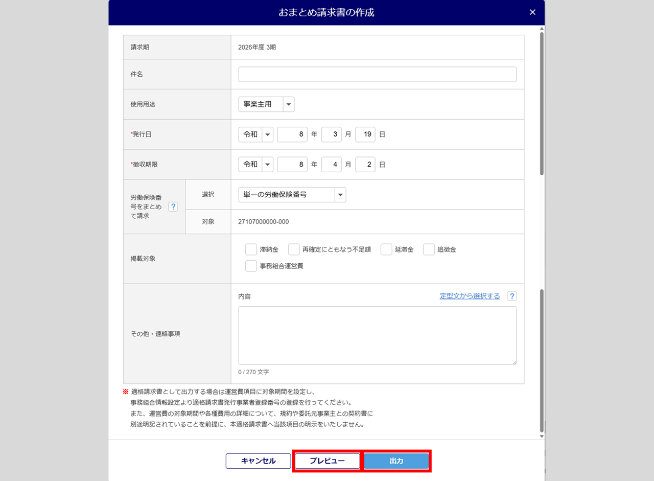 | 掲載対象 | チェックすると、請求に含める各金額の「年度・期」または「請求日」の開始・終了日の入力欄が表示されます。 「事務組合運営費」にチェックすると、「適格請求書項目」が表示されます。 「掲載する」を選択した場合、おまとめ請求書に運営費対象年月、適格請求書発行事業者登録番号を出力します。 |