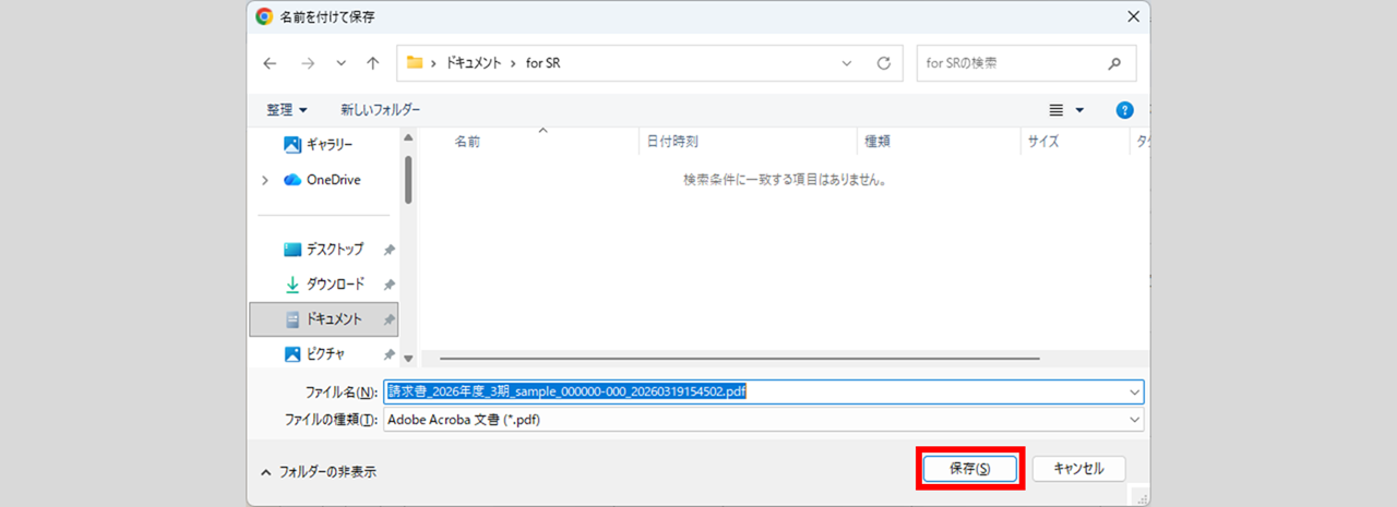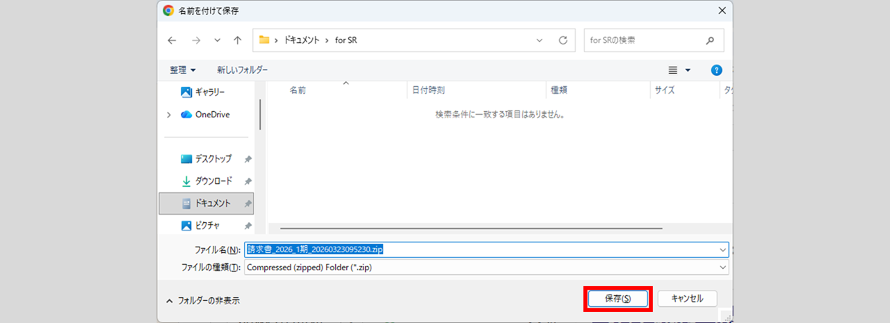 操作しているPCのフォルダ画面が表示されますので、任意のフォルダを指定し、[保存]をクリックします。