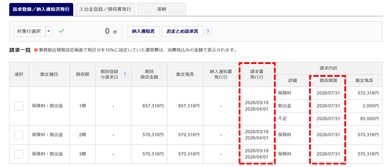 出力時に入力した「徴収期限」「請求書発行日」が一覧に反映されます。
